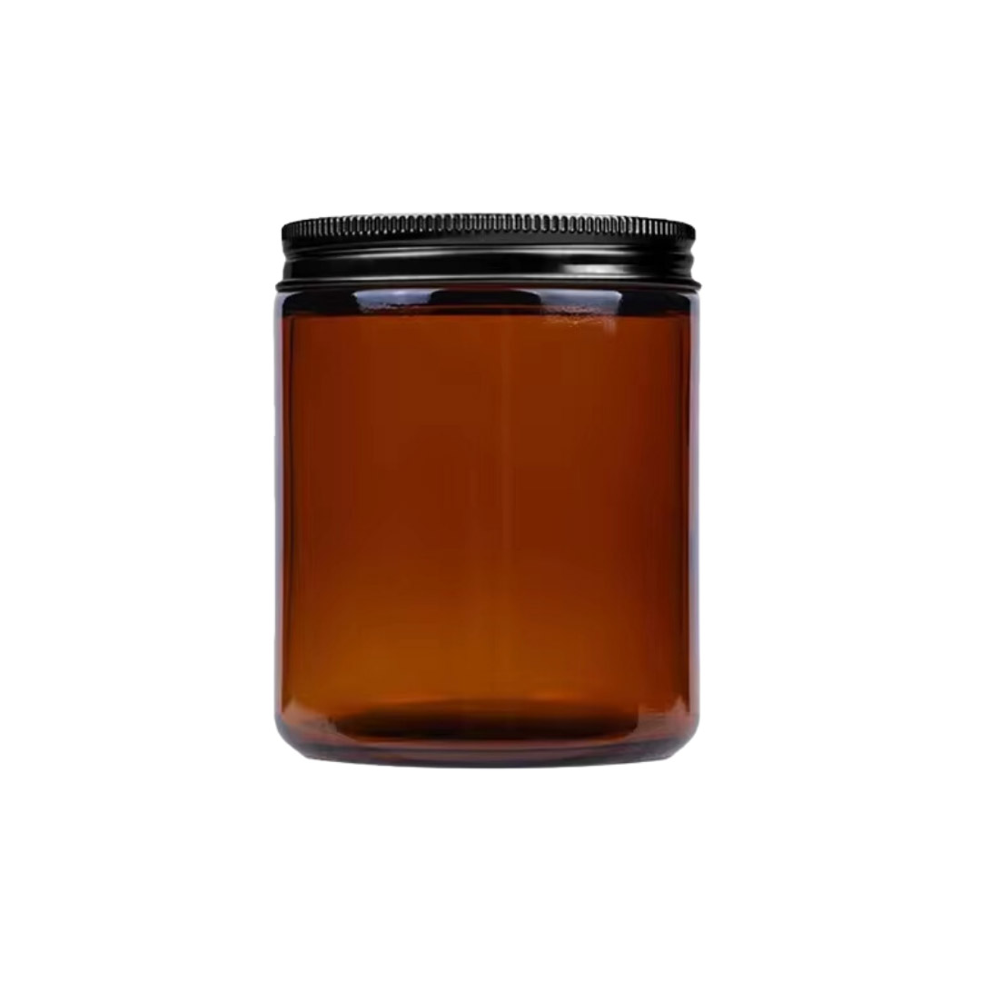 FRASCO DE VIDRIO AMBAR CON TAPA NEGRA (250GR) Dia 7.2cm x Alt 9.0cm