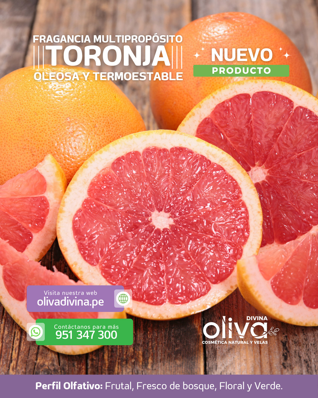 Fragancia soluble en aceites y grasas, compatible con productos cosméticos.